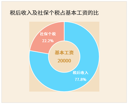 基本工(gōng)資由企業(yè)支付,然後需要繳納社保金(jīn)和(hé)個(gè)稅(這裏簡稱爲社保個(gè)稅),剩下的(de)就是稅後收入,下面這幅圖可(kě)以展示這兩塊的(de)占比,同樣以基本月(yuè)薪20000元爲例: