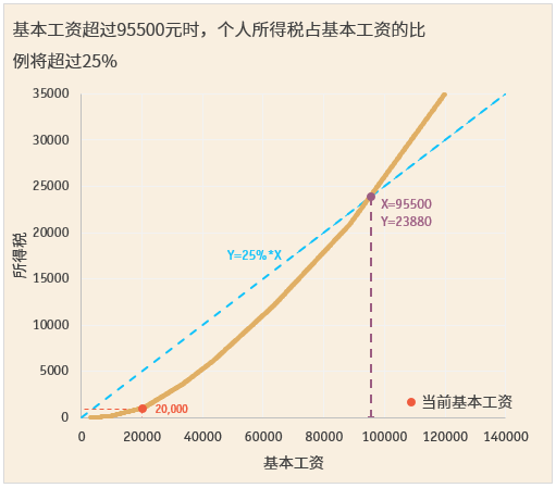和(hé)前面個(gè)稅占基本工(gōng)資的(de)比例圖表所展示的(de)一樣,當基本工(gōng)資超過95500元時,個(gè)稅(也(yě)稱作所得稅)的(de)曲線出現了一個(gè)拐點,出現了一個(gè)表示所得稅上(shàng)升速率超過其它指标的(de)拐點。