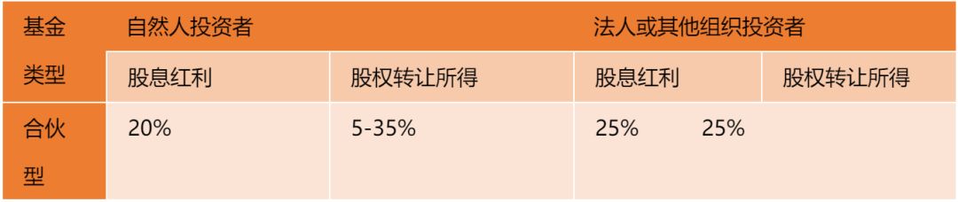 北京:京金(jīn)融辦[2009]5号文(wén)規定,合夥制(zhì)股權基金(jīn)中個(gè)人(rén)合夥取得的(de)收益,按照(zhào)“利息、股息、紅利所得”或者“财産轉讓所得”稅目征收個(gè)人(rén)所得稅,稅率爲20%。