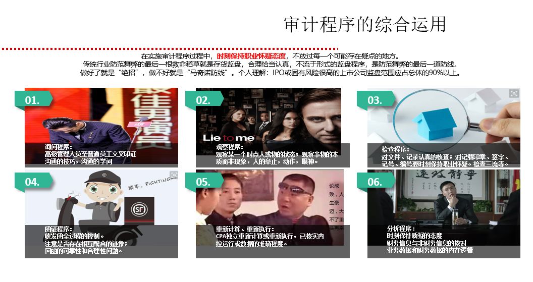 請審計(jì)人(rén)員要時刻注意,被訪談者可(kě)能(néng)基于某種目的(de)可(kě)能(néng)實施舞弊,而對我們提出的(de)問題有(yǒu)所隐瞞,可(kě)能(néng)會(huì)用(yòng)他(tā)們精湛的(de)“演技”迷惑我們,對我們講故事,說謊話(huà)。正所謂,人(rén)生如(rú)戲,全靠演技。我們這些注冊會(huì)計(jì)師(shī)應該怎麽辦?我們可(kě)以通過對不同層級的(de)人(rén)員進行(xíng)交叉訪談,以驗證真僞,可(kě)以結合其他(tā)程序輔助核實等等。所以溝通的(de)目的(de)是爲了通過其他(tā)渠道獲取其他(tā)審計(jì)證據,比如(rú)行(xíng)業(yè)資料、經營及财務數據進行(xíng)驗證。還有(yǒu)在某些情況下,對詢問的(de)答複爲注冊會(huì)計(jì)師(shī)修改審計(jì)程序或實施追加的(de)審計(jì)程序提供了基礎。
