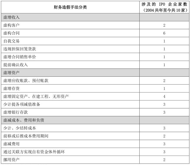 本次研究選取了保薦制(zhì)實施以來(2004 年至今)中國證監會(huì)公告的(de)行(xíng)政處罰決定書(shū)涉及的(de) 10 家 IPO 企業(yè)作爲分(fēn)析對象,結合COSO 發布的(de)《Fraudulent Financial Reporting, 1998-2007》虛假财務報告中所列的(de)常見财務造假手段,将這 10 家企業(yè)涉及到(dào)的(de)财務造假手法分(fēn)類統計(jì)如(rú)表 1 所示。